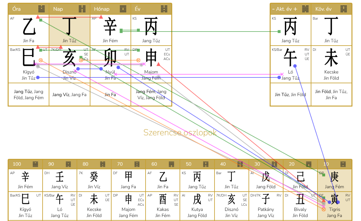 • A születési képlet és a szerencseoszlopok közötti kapcsolatokat is mutatja