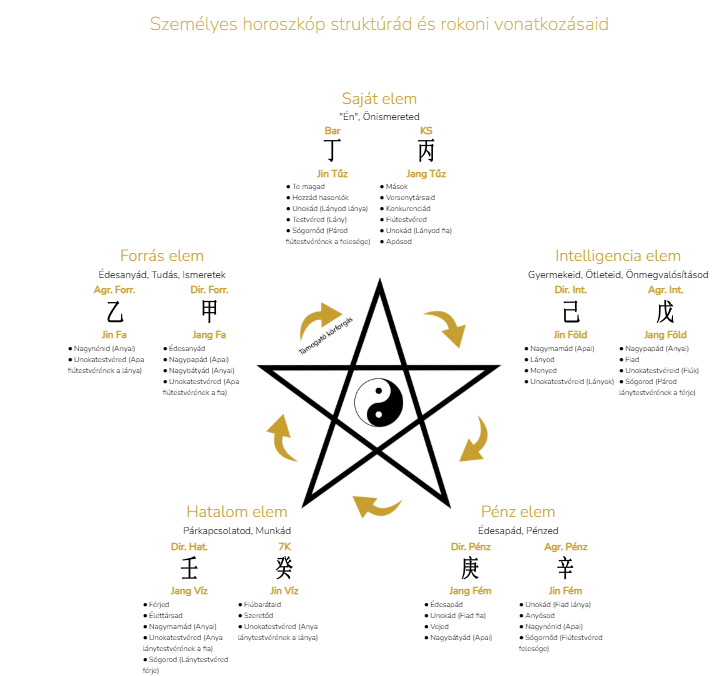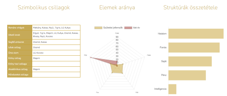 Struktúrák összetétele & Szimbolikus Csillagok & Elemek aránya diagramok izuális megjelenítése a Suzannamester Kínai Asztrológia Kalkulátorban: